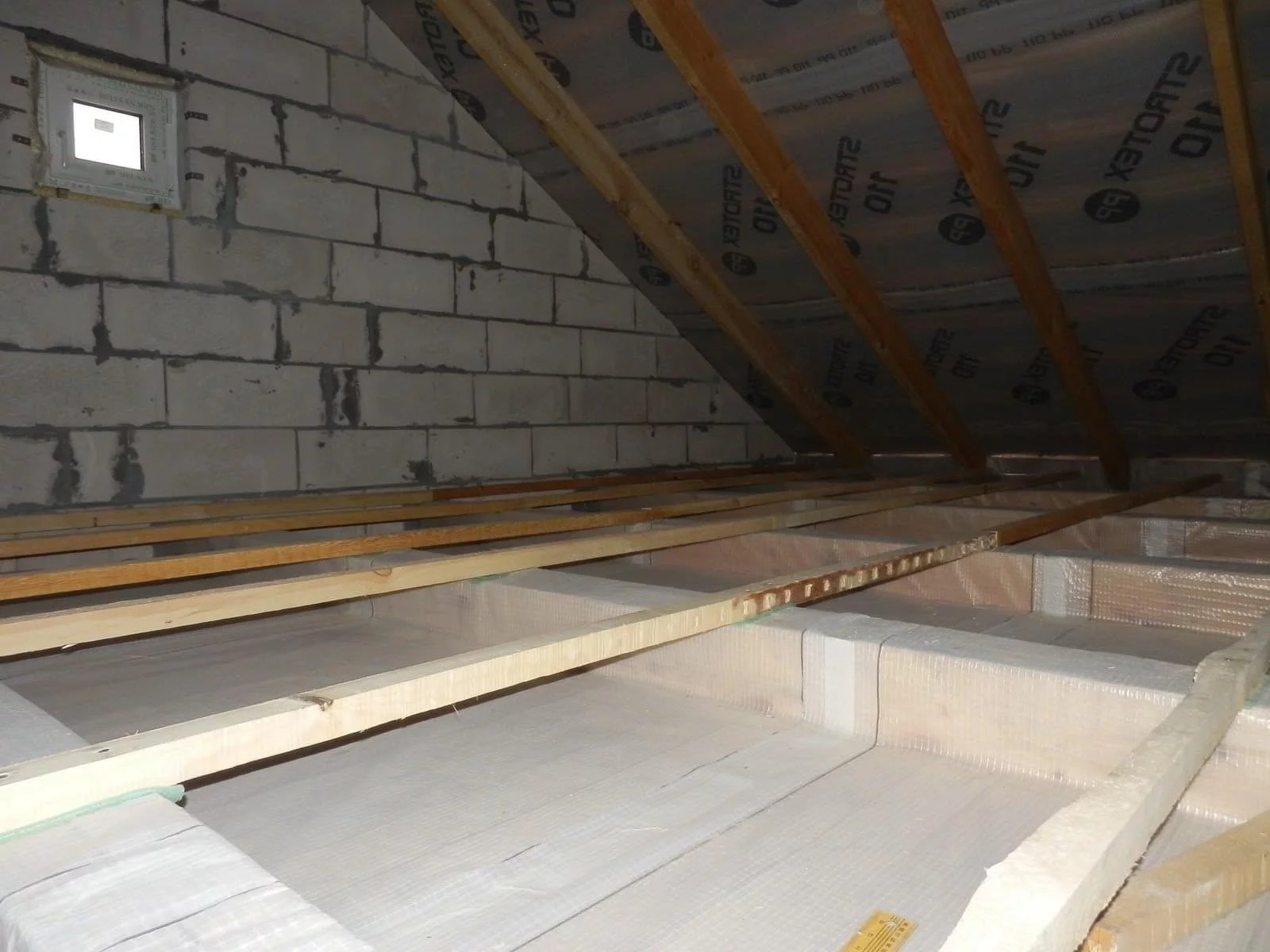 - Со стороны чердака монтируем пароизоляцию, полосы материала располагаем внахлест, проклеиваем края строительным скотчем.