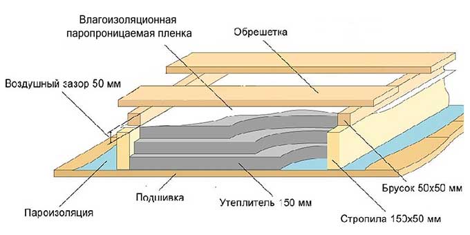 «Пирог» можно собрать над балками, такой вид работ легче и займет меньше времени. В этом случае листовой настил закрепляют на брусках со стороны чердака, затем на него кладут пароизоляцию, утеплитель, гидроизоляцию, финишное покрытие.